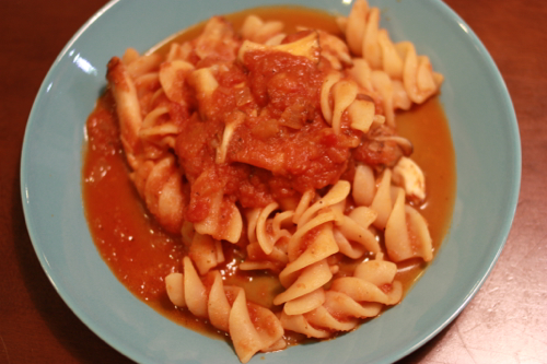 この間コストコで買った半生パスタを、自家製トマトソースで。