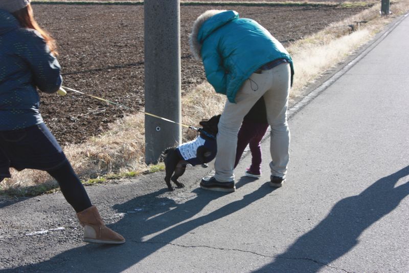 茂吉が飛びつきそうで必死にリードを引っ張る、私。