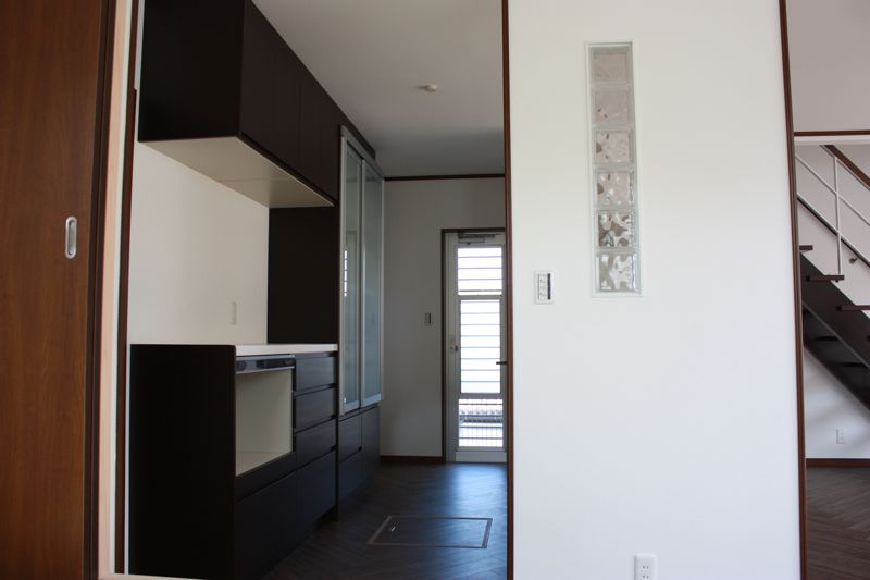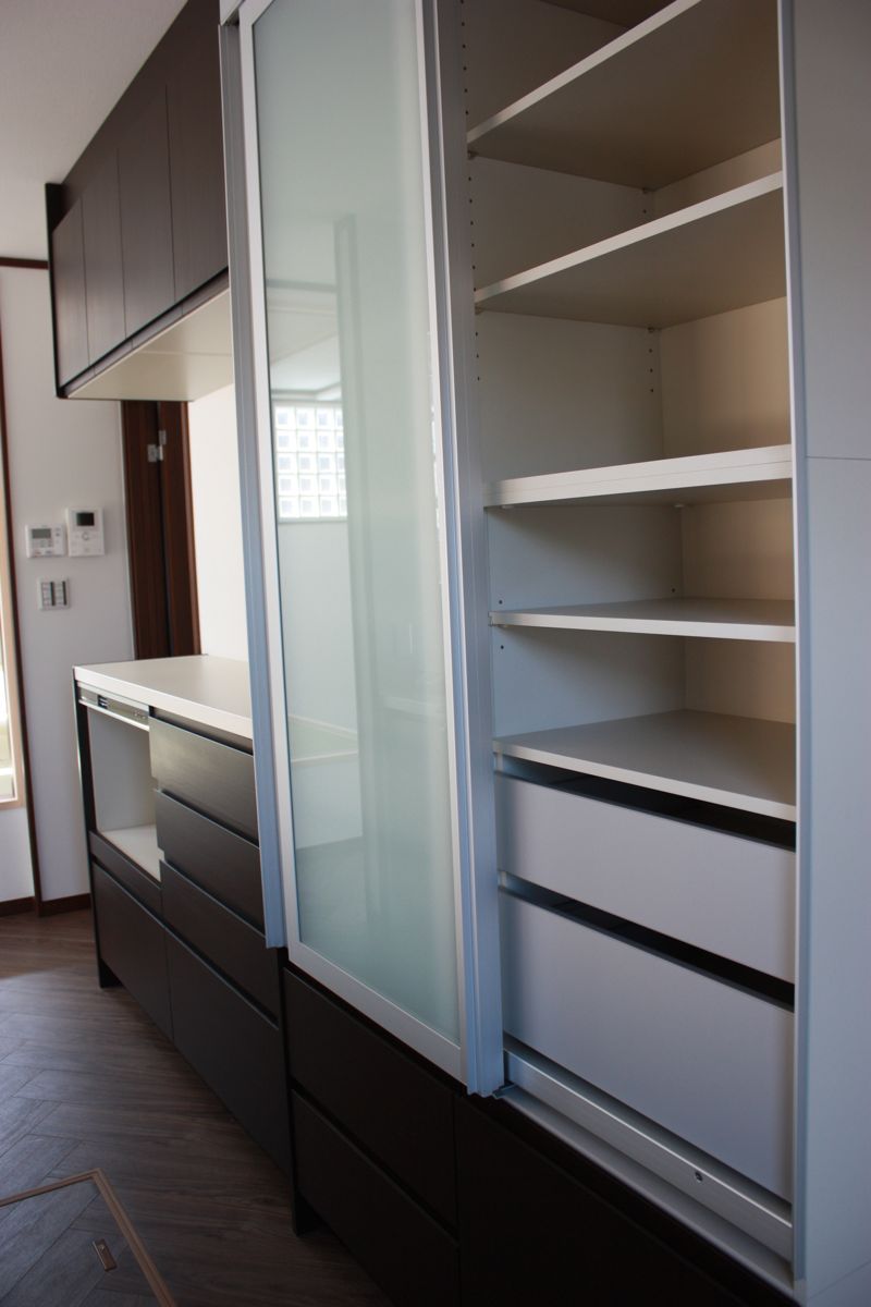 全部黒だと重いので、食器棚の方は半透明のアクリルパネルにしました。