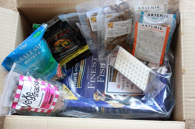 フード、乾燥わかさぎ、おやつ、ケッシーのラバーブラシ、おまけのフードサンプル。