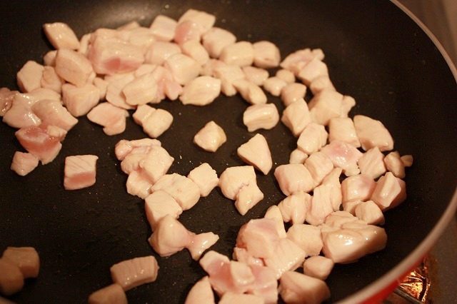 少量のごま油で鶏肉を炒めて、軽く焦げ目をつけて…