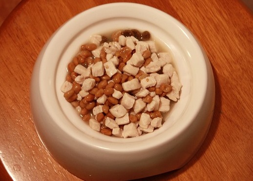 後はぬるま湯程度に冷まして、いつものフードに乗せました♪
