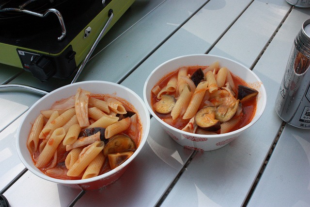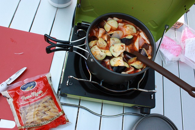 簡単に、トマト缶を使ったラタトゥイユ風のスープにペンネを投入。