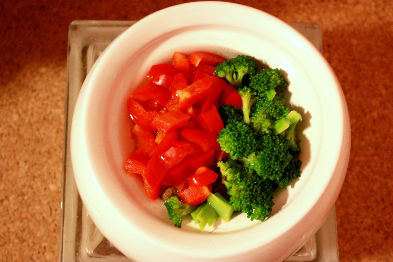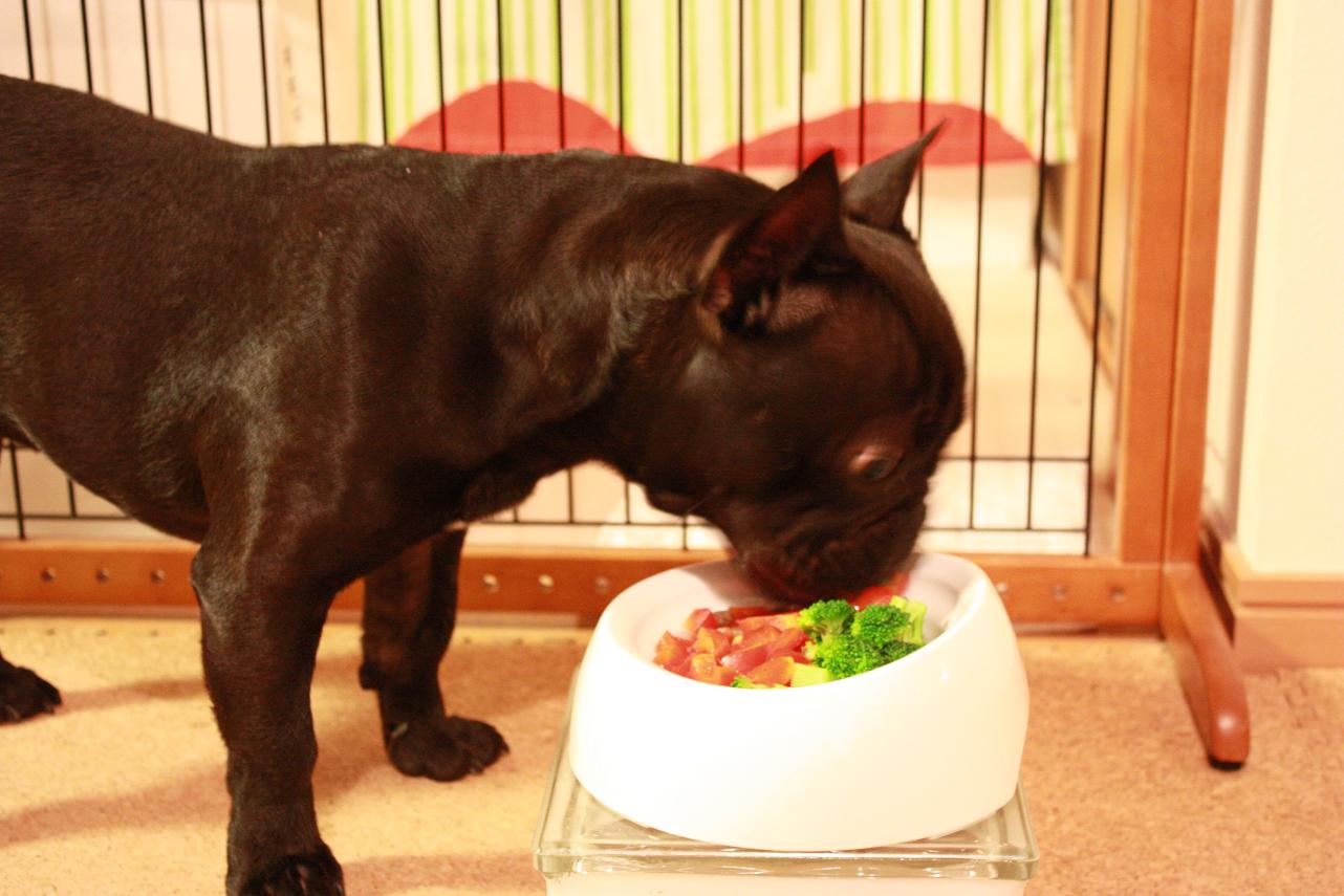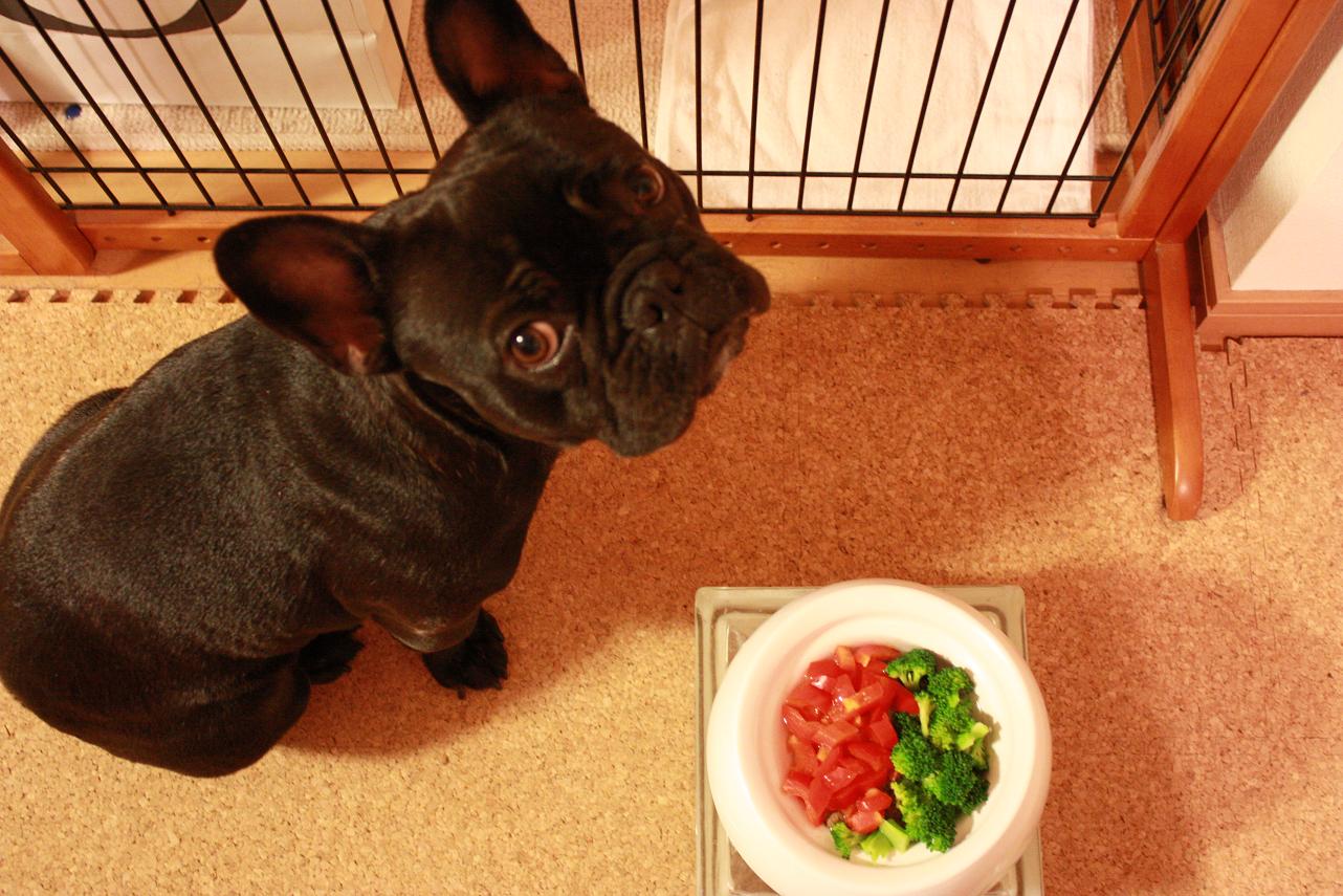 赤いパプリカ、ブロッコリーをいつものフードの上に。