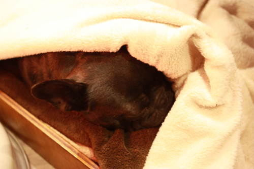 寒さに耐える茂吉さん…ごめんよ、コット持ってこなくて。